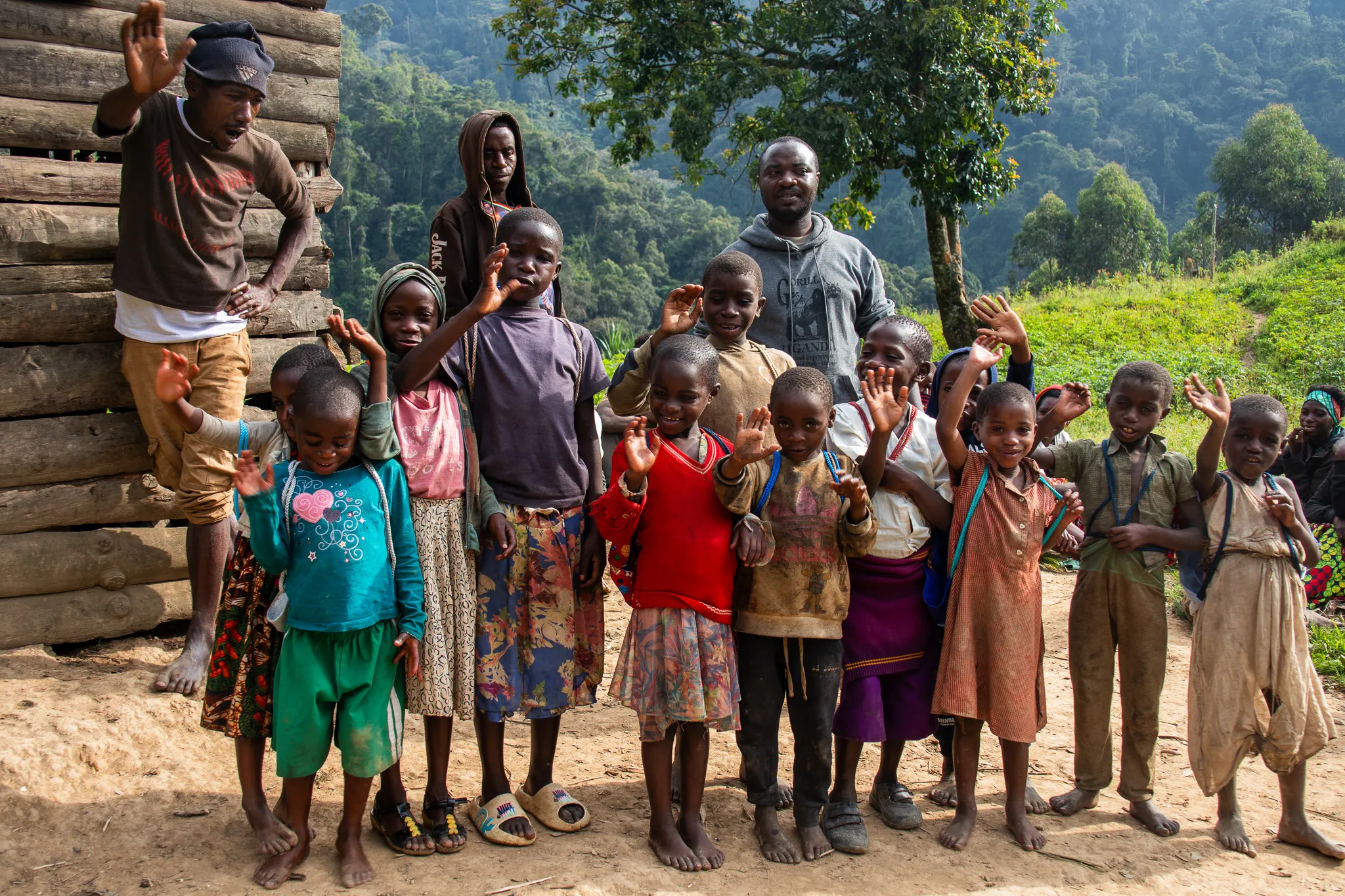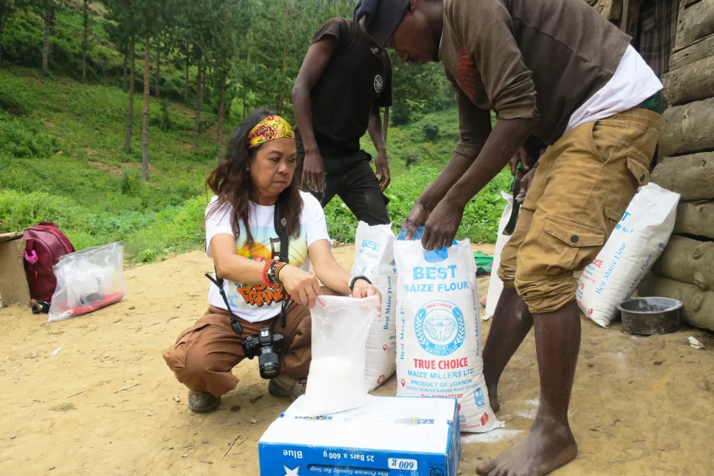 We brought posho (starchy porridge) and a box of soap for the Batwa families and distributed drawstring backpacks to the children. We split the posho and soap so that each family received their share. It wasn’t much, but it was something, necessities that would help them get by a little longer.