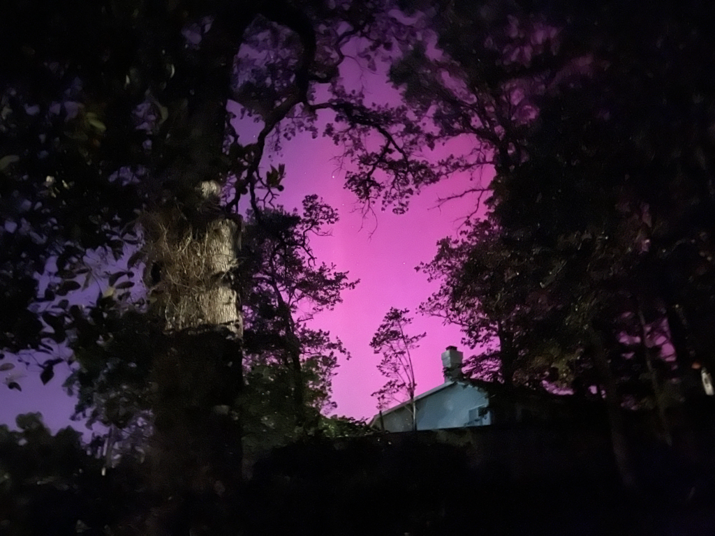 The members of the Aurora Notification Group living in the lower 48 were posting the most stunning Aurora photos from their backyards and parking lots, visible from even their kitchen windows! At 11:35 PM, I stepped outside, my heart pounding with anticipation, to see if she was visible. I know that the Aurora appears very faint to the naked eye. Many auroras are invisible to the naked eye, especially with light pollution. Using my iPhone compass, I tried to find where I could see the north. And a faint magenta color was on the horizon; like a whisper of magic, she was there! With my excitement, I texted some of my friends to go out and see the Aurora. Sadly, most were asleep and missed one of the most amazing natural phenomena. I stayed in the backyard until 1 AM, and the Aurora lit up my backyard in a mesmerizing display of magenta hues, as if the sky were dancing.