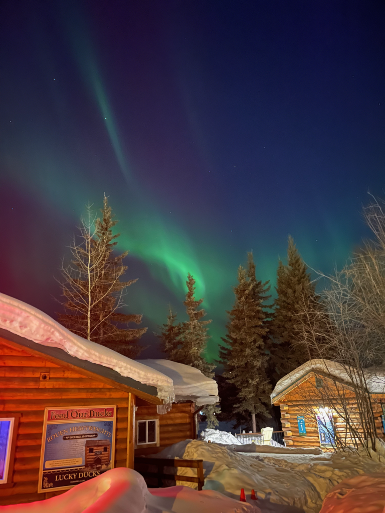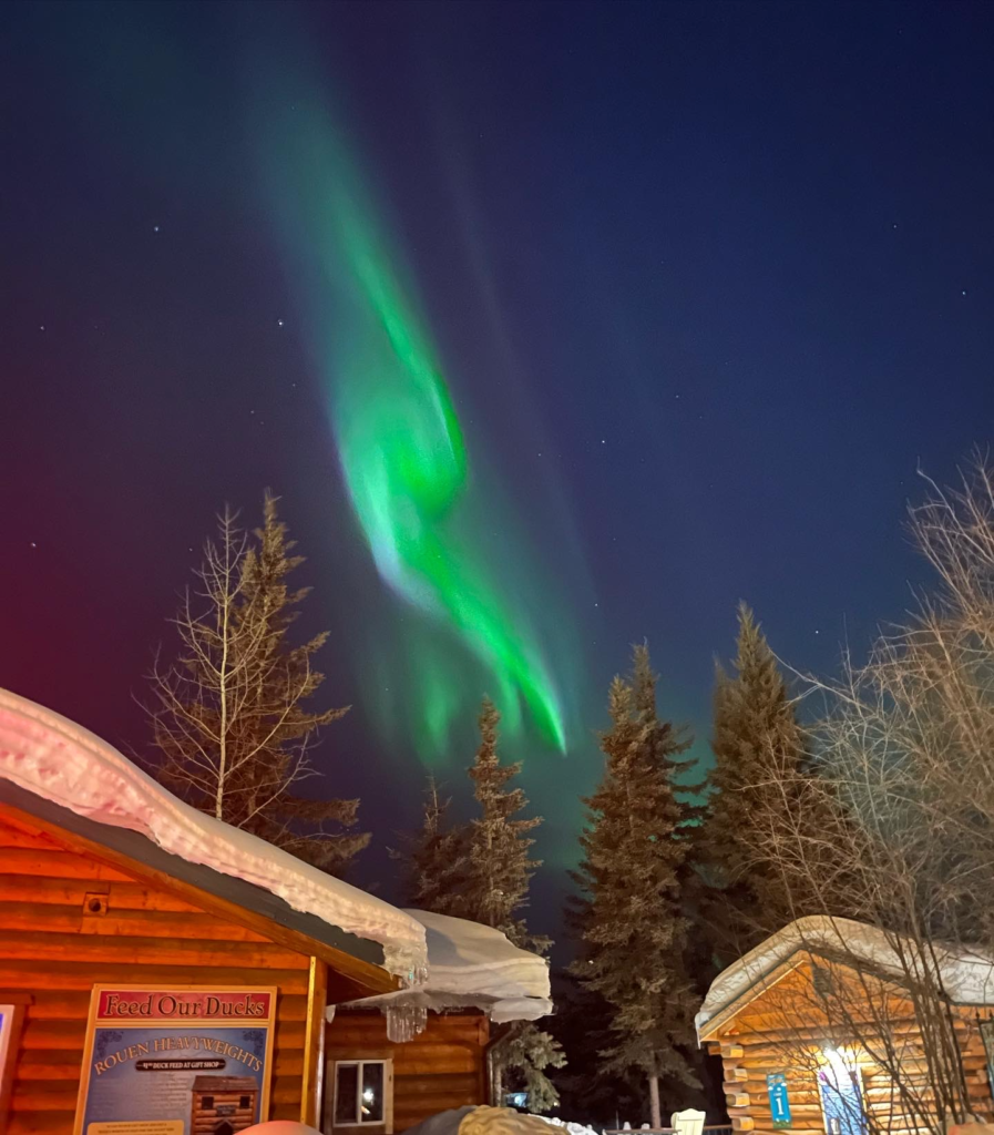 Initially, our plans for our Fairbanks trip were a long weekend getaway, giving us two chances to catch a glimpse of the Aurora. Of course, there are no guarantees when encountering Mother Nature’s wonders. Amidst my preparations, I stumbled upon a wealth of knowledge embodied in one individual—Amy, the Aurora Borealis Notifications Group curator on Facebook. Despite my persistent inquiries for assurances, her response remained consistent: with clear skies, no light pollution, and a stay for at least five days in Fairbanks, the odds of witnessing the Aurora are greatly enhanced.