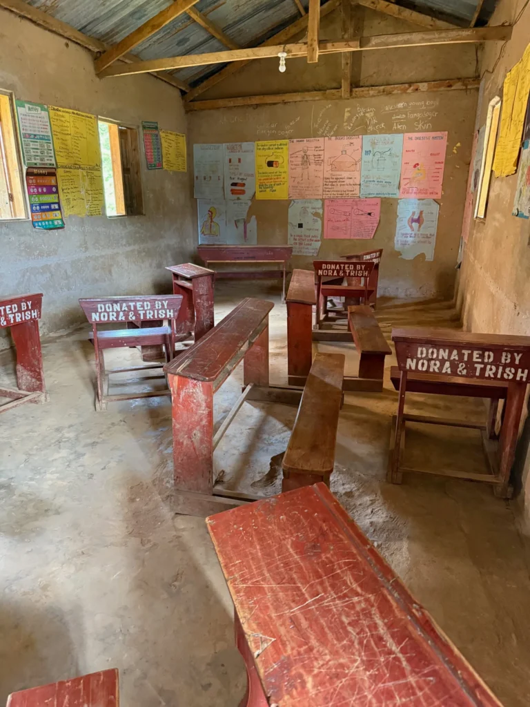 When Mr. Godfried, the principal, showed me around, our first stop was the classroom. Small rooms with dark concrete walls. Lessons are taped to scraps of paper. The floors are part concrete, part sand, sometimes hiding broken glass that cuts their feet. Learning happens anyway. This is where they learn. This is where they spend their days.